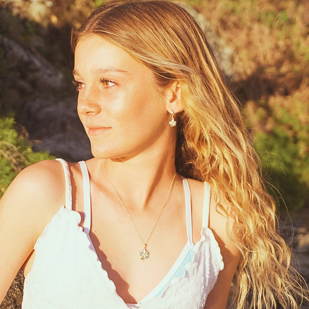 Tropical elegance, captured in gold. Our Tahiti Frangipani Necklace and Earrings Set is inspired by the beauty of island blooms and sunlit shores. Featuring delicate frangipani flowers, this matching set is crafted in sterling silver with a luxe 14k gold plating—giving you the beauty of fine jewellery with the durability of ocean-safe jewellery you can live in. Perfect for adding a touch of tropical charm to any outfit, this set is just as stunning for everyday wear as it is for special occasions.